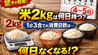 米2kgは何日持つ?1日3合食べた場合の消費日数をわかりやすく解説します。米2kgは約13合分なので、毎日3合食べると約4〜5日でなくなる計算です。一人暮らしの平均的な米消費量や5kg・10kgの目安、米を無駄なく管理するコツまで詳しく紹介します。