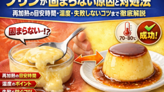 プリンが固まらない原因と正しい対処法を徹底解説。再加熱の目安時間・温度管理・失敗を防ぐコツから、安全に食べられるかの判断基準まで初心者向けにやさしく解説。ゼラチン補強やリメイク方法も紹介します。