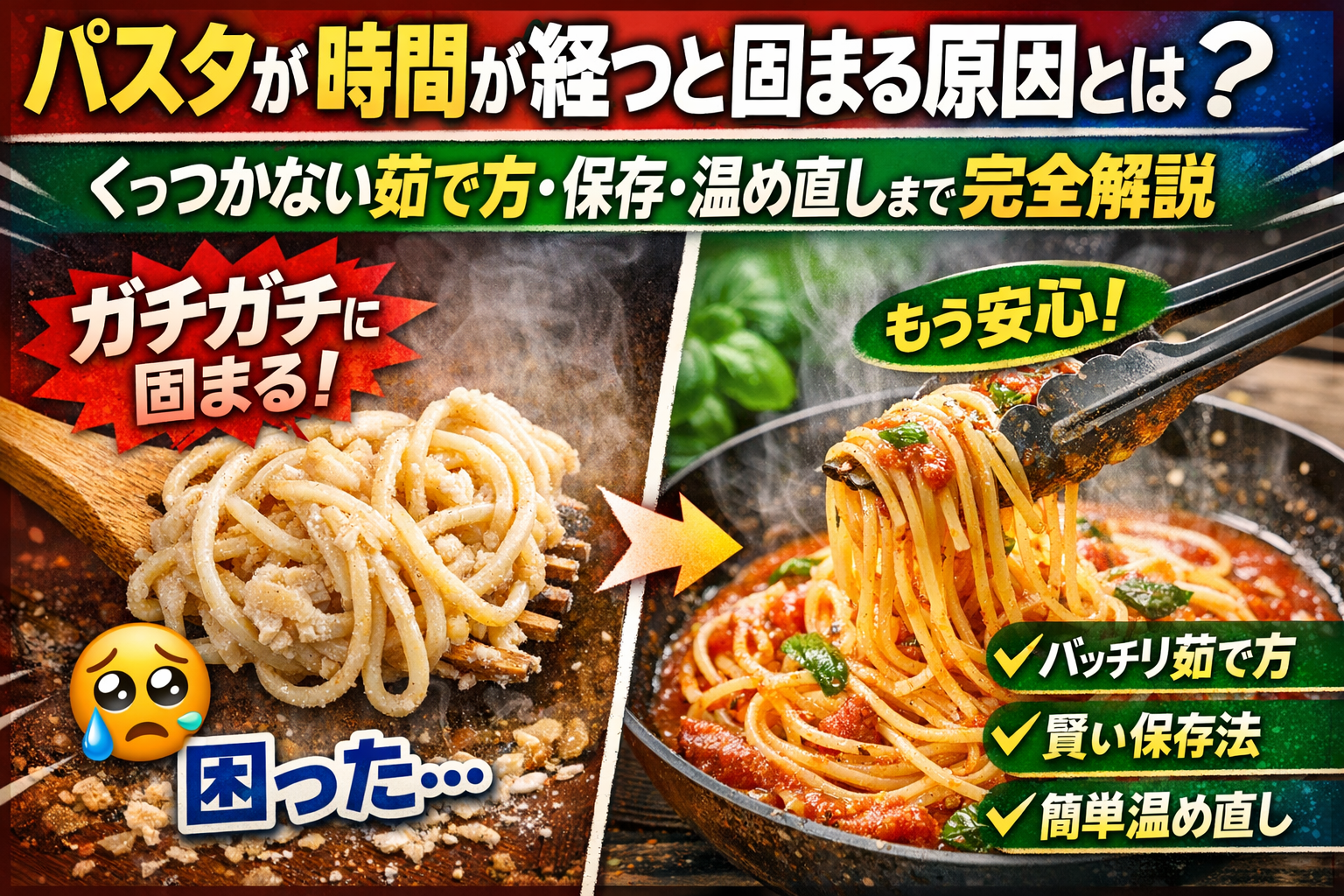 茹で方・仕上げ・保存・温め直しまで完全網羅しているので、読み終わる頃には「もう固まらないパスタ」が当たり前になります。